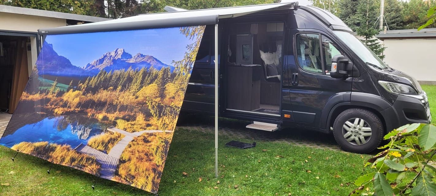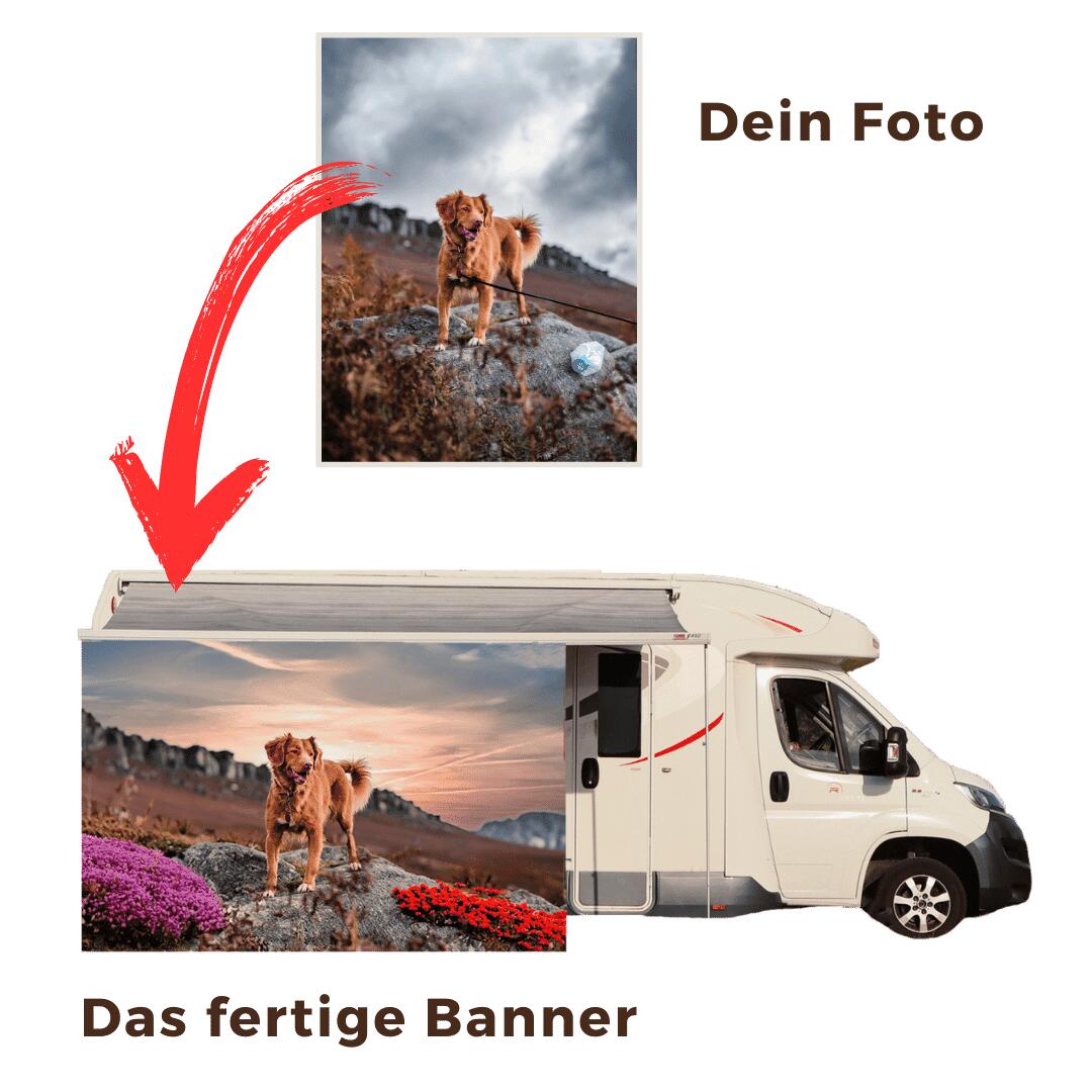 Unabhängig davon, für welches Wohnmobil / Wohnwagen Banner du dich entscheidest, hast du bei uns immer die Möglichkeit, dein Wohnmobil / Wohnwagen Banner selbst gestalten zu können. So kannst du deinem Wohnmobil / Wohnwagen Banner ein persönliches Design verleihen. Indem du uns dein Lieblingsbild zur Verfügung stellst, können wir es in hoher Qualität auf dein neues Wohnmobil / Wohnwagen Banner drucken.