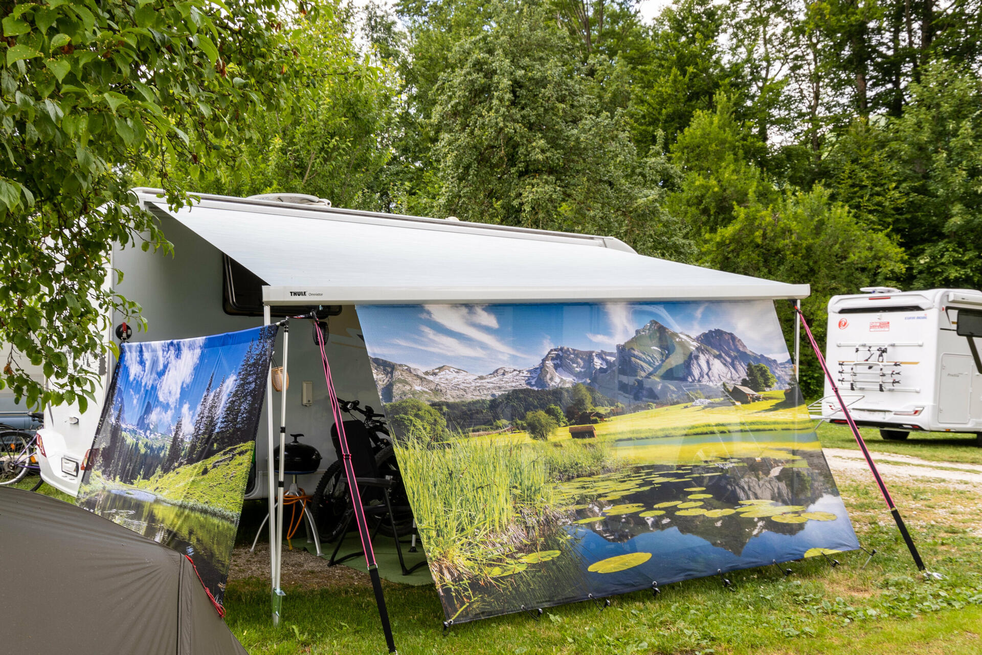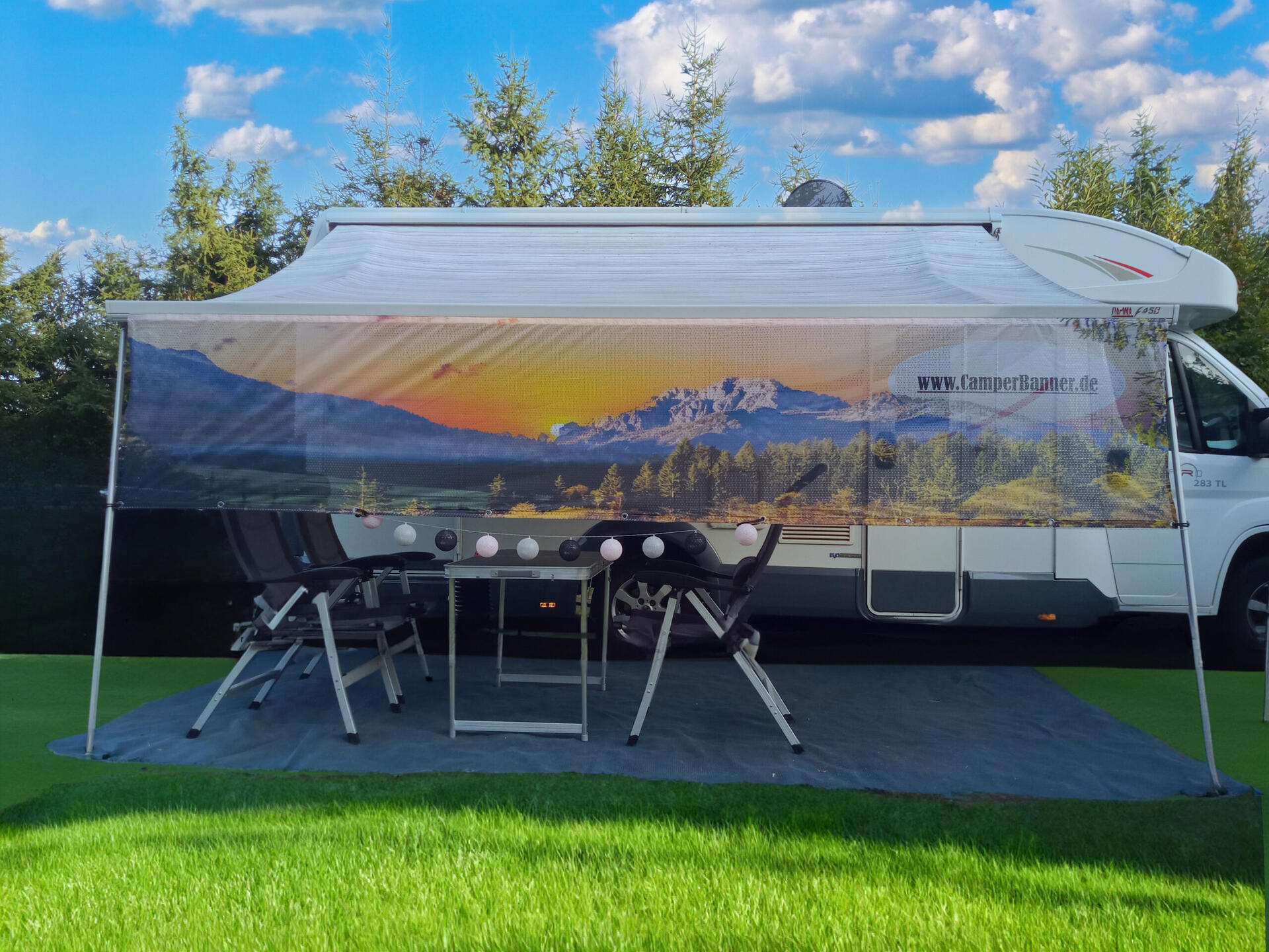 Mit einem vollständigen Wohnmobil / Wohnwagen Banner entscheidest du dich für eine echte Allround-Lösung. Diese Banner reichen von der Markise bis zum Boden und bieten an der Frontseite somit einen vollständigen Schutz vor Witterung und neugierigen Blicken. In unserem Sortiment kannst du dich zwischen vielen verschiedenen Motiven entscheiden, sodass du mit Sicherheit ein Markisen Banner findest, das deinem Geschmack entspricht. Damit kannst du deinem Lagerplatz nicht nur eine persönliche Note verleihen, sondern dich auch richtig wohlfühlen.